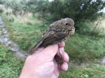 More birds moving early on but it tailed off again by 8am. Min 18 Tree Pipits went over and most dropped in around net area and with another 9 being caught and ringed it took the total so far to 34!! Amazing considering the almost total lack of any sightings from elsewhere in our area. A bonus Spotted Flycatcher was feeding in the pathside trees before moving off. 1st one i`ve seen up there. A few Mipit went south from dawn but soon stopped. Long-eared Owl flushed from trees.