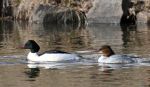 Goosander.....four Females, one with a very attentive Male in stunning breeding plumage.