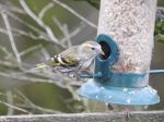 siskin - min 2 males & 1 female at the feeders at Calf Hey. The female has a metal ring on the right leg