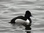 Once at Martin Mere I headed straight over to the Discovery Hide, the big main hide, to see the Ring Necked Duck.  I scanned but didn't see it which was really strange because it was supposed to be right in front.  Anyway within a few minutes it did appear, it's pale grey sides giving it away.  It started diving right in front of the hide, what it was eating I have no idea.    It was  with Pochard and Tufted Duck.  It was probably the same bird that had wintered in St Helens the last 2 years.  Ring Necked Ducks frequently cross over form North America.  They aren't considered Rarities but Scarcities as there are definitely more than 10 records per year.  Some of them are returning birds.  They must breed somewhere in Northern Europe in pure pairs.  Pairs are recorded in Britain and Ireland, occasionally small flocks too.